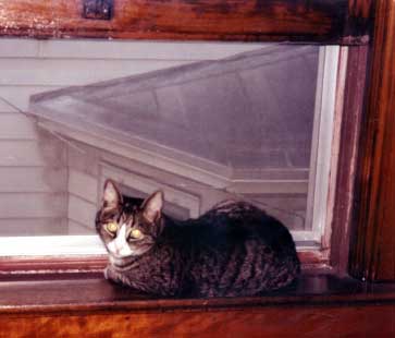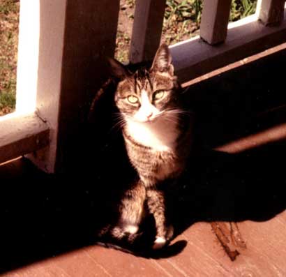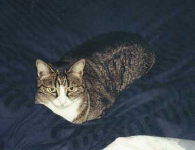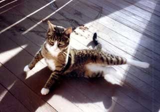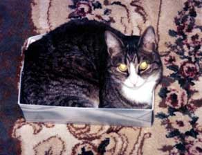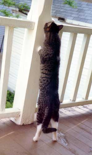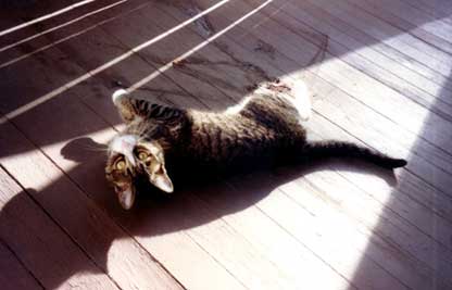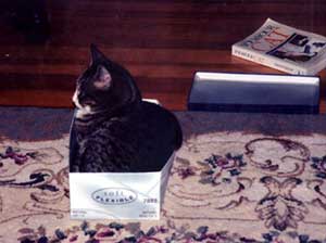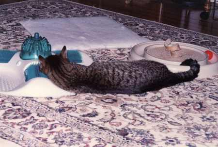 In August 2001, I buy Snufkin a “CatSpa” because the cat on the box looks like her. The model is shown grooming herself on the green brushes, giving herself a massage on the white bumpy areas, and cleaning her teeth and gums by chewing on the little ball in the middle.