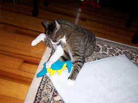 Featured here: a feather wand, scratchy cushion, felt dinosaur, catnip pellets, catnip bubbles.