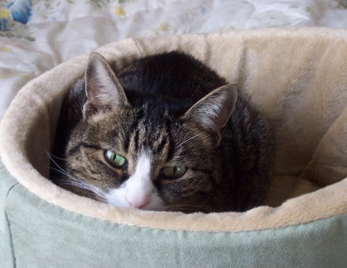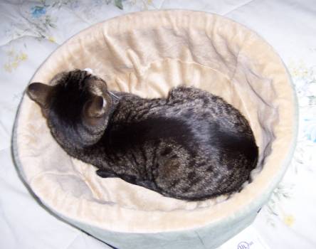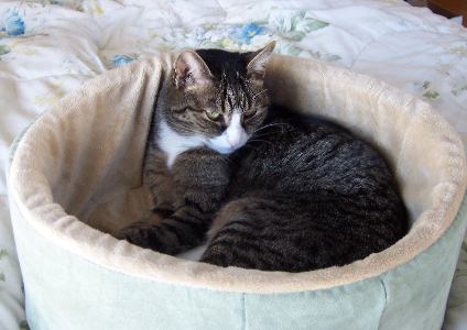 And Snufkin got a Thermo-Kitty Bed — her eighth bed — to keep her warm during the long and bitter winter in Nebraska. Unlike her two previous heated beds, this one has raised sides for extra warmth. It has a dual thermostat, staying a few degrees above ambient temperature when unoccupied but warming to a toasty (and cat-appropriate) 102° F/39° C when in use. |