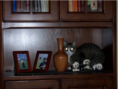 Snufkin’s semi-annual blood test in October 2007 was worrisome. Although her creatinine and BUN were within normal range, almost all her electrolytes were not, indicating that her early-stage kidney disease is not under control. Having refused the other options (powder and gel), Snufkin must take a potassium pill every day for the rest of her life. Fortunately, I’ve become fairly proficient with the pill gun, so the daily pilling hasn’t lowered her quality of life as much as I’d feared. Most mornings she takes the pill like a Good Girl, with only a little fuss. |